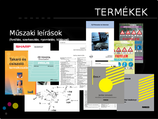 Tipográfiai tevékenységünk kiszolgálja valamennyi üzletágunkat. Nemcsak különféle nyomdai kiadványok, hanem szitázott, tamponnyomással jelölt, dekorációs és gravírozott termékek előkészítését, tervezését is vállaljuk. Technikai dokumentációk elkészítését saját fejlesztésű automatizált rendszerünk segítségével rendkívül rövid határidővel tudjuk vállalni, mivel a lefordított anyag a lektorálást és korrektúrát követően néhány órán belül nyomtatható.